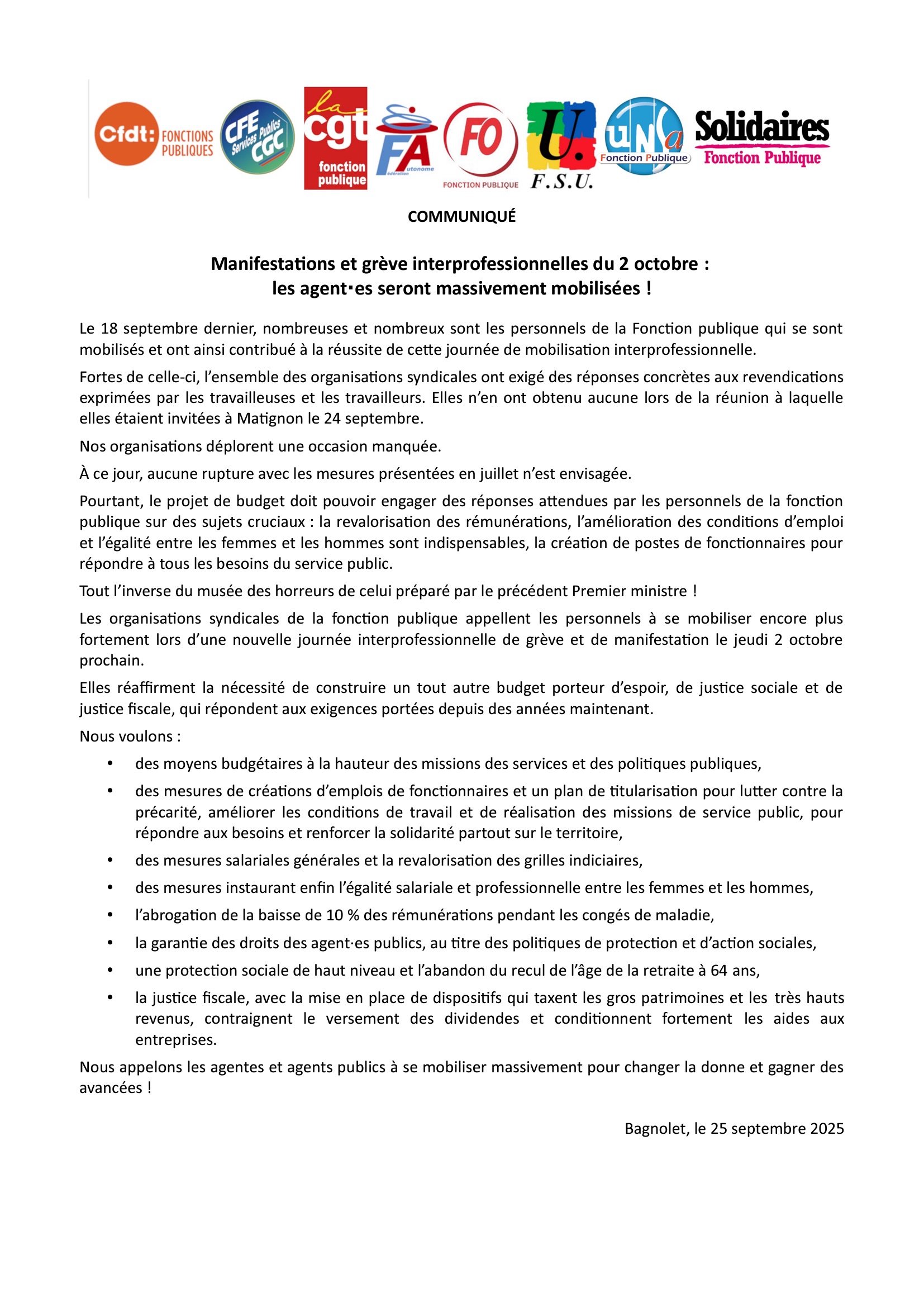 Les organisations syndicales de la fonction publique appellent les personnels à se mobiliser encore plus fortement lors d’une nouvelle journée interprofessionnelle de grève et de manifestation le jeudi 2 octobre prochain.