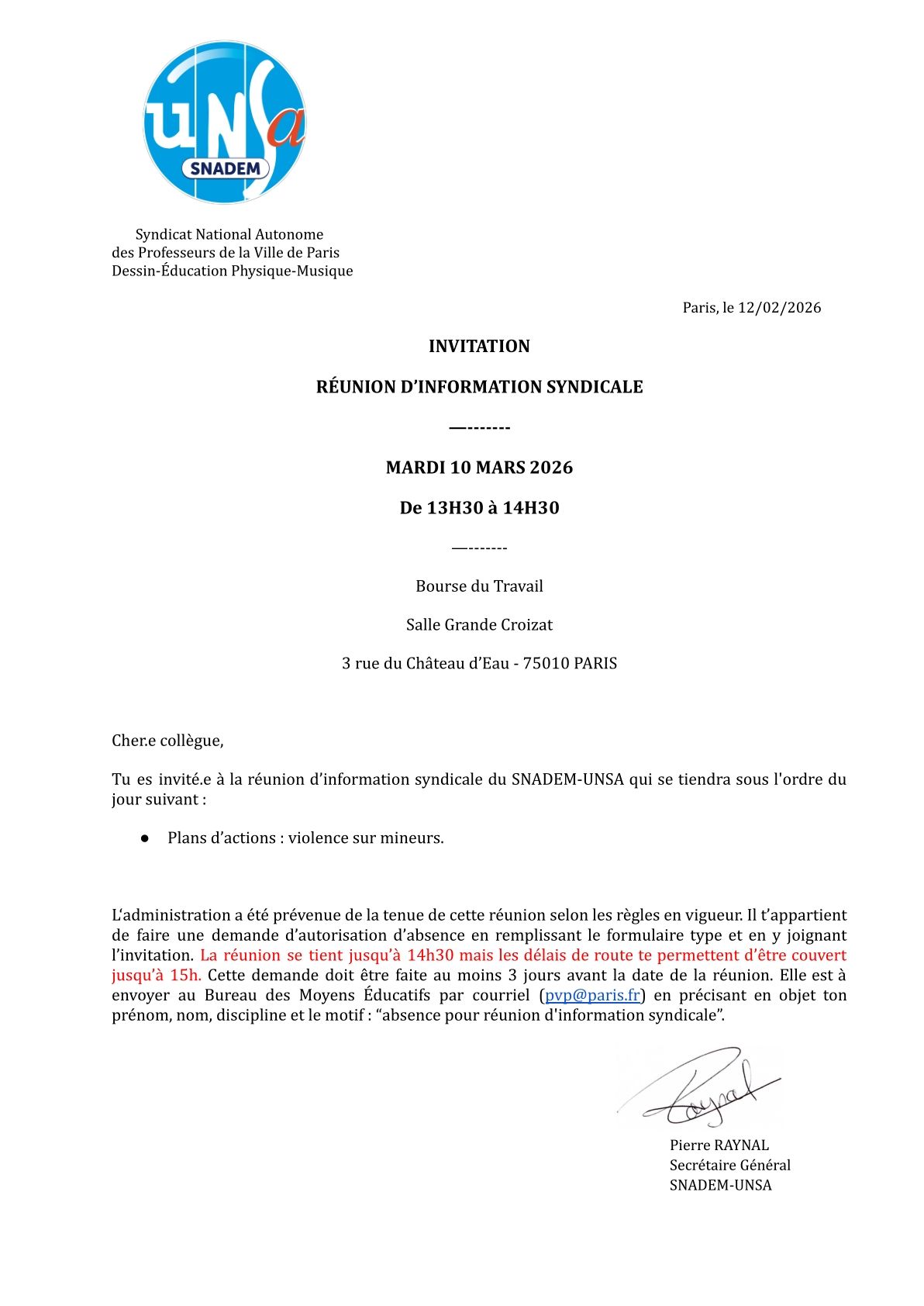 Nous souhaitons vous réunir afin d’évoquer le sujet lors d’une réunion d’information syndicale. Elle se déroulera le mardi 10 mars 2026 de 13h30 à 14h30.