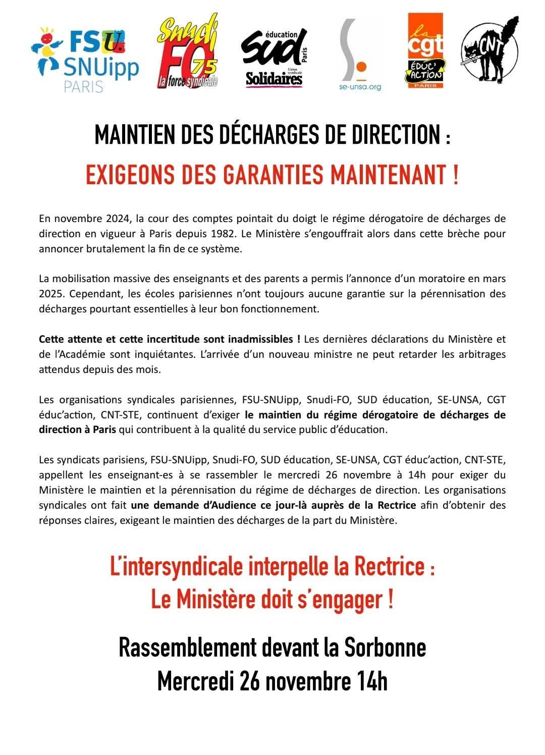 Les syndicats parisiens, FSU-SNUipp, Snudi-FO, SUD éducation, SE-UNSA, CGT éduc’action, CNT-STE, appellent les enseignant-es à se rassembler le mercredi 26 novembre à 14h pour exiger du Ministère le maintien et la pérennisation du régime de décharges de direction. Les organisations syndicales ont fait une demande d’Audience ce jour-là auprès de la Rectrice afin d’obtenir des réponses claires, exigeant le maintien des décharges de la part du Ministère.